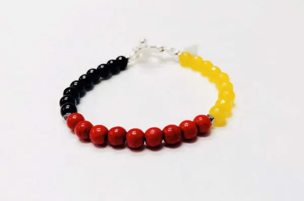 +// 100% Black Howlite 6mm Stones, 6mm Red Howlite Stones, 6mm Gold Agate Stones, Silver Hematite Spacers, Metal Wire, Silver Plated Metal Clasp and Sterling Silver ARBARI Tag.