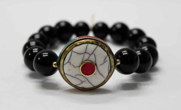 // 100% Round Tibetan Brass Turquoise Coral And White Conch Shell Inlay Bead, 14mm Black Onyx Stones, Gold Plated Metal Spacers, Stretch Cord and 14K Gold ARBARI Tag.