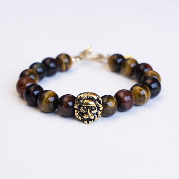 +// Gold Plated Stainless Steel Lion Head, 10mm Multi Color Tiger Eye Smooth Stones, Gold Metal Wire, 18K Gold Filled Toggle Clasp and 14K Gold Plated ARBARI Tag.