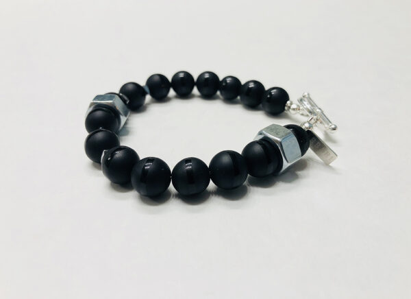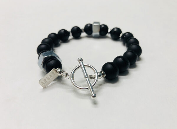 +// 100% Silver Metal Nut, 10mm Matte Black Onyx With Shining Stripe Stones, Silver Hematite Spacers, Metal Wire, Sterling Silver Toggles and Sterling Silver ARBARI Tag.