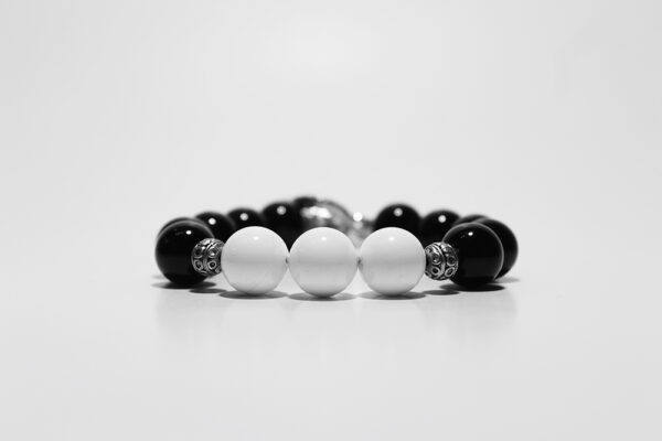 +// Official Armando Barillas Merchandise.+// Yin Yang Bracelet+// Hand Crafted in the U.S.A.+// 100% White Shell Stones, Black Onyx Beads, Silver Metal Wire, Silver Plated Metal Clasp and Sterling silver ARBARI Tag.
